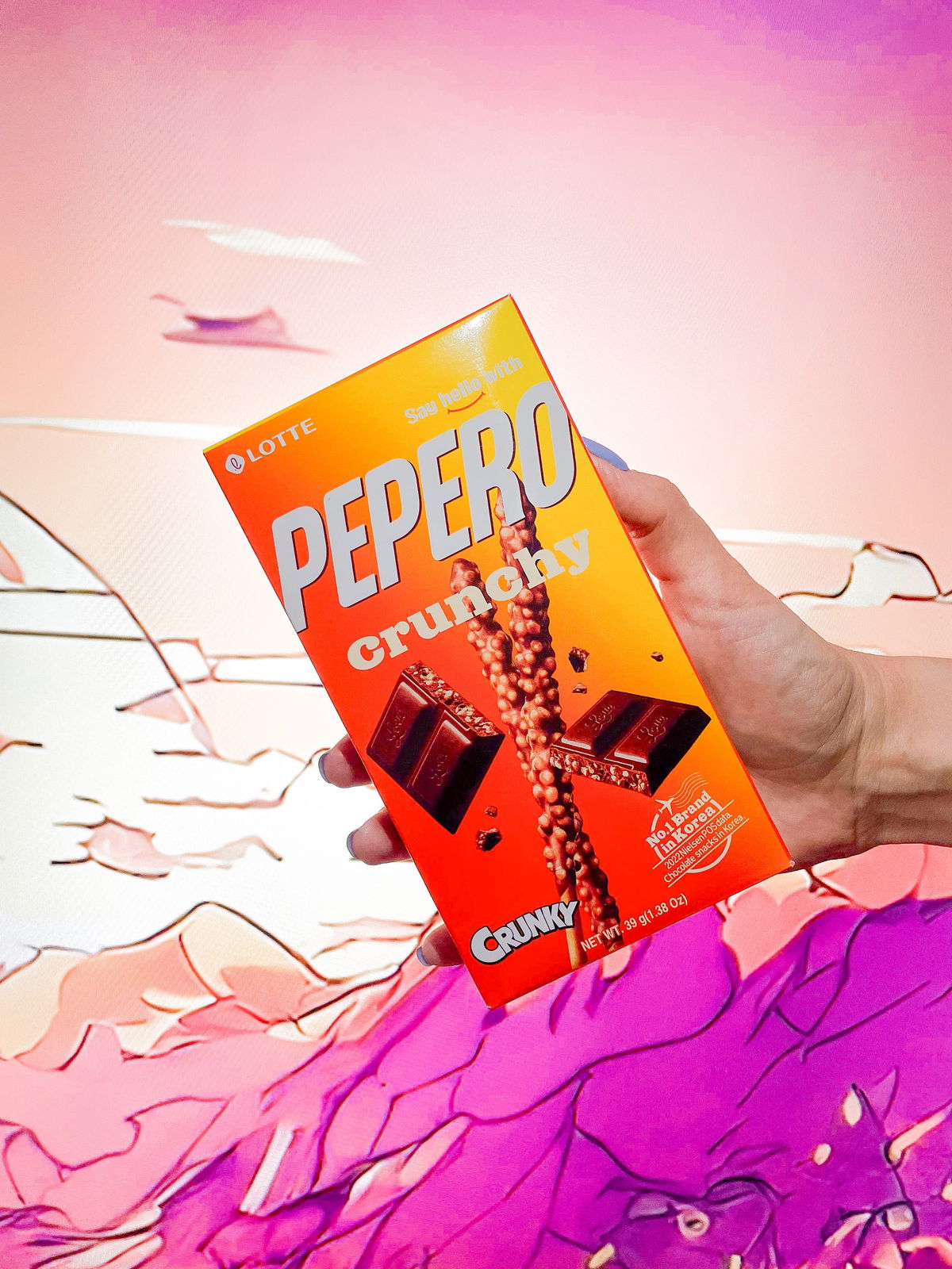 PEPERO es un snack coreano formado por palitos finos de galleta cubiertos con distintos tipos de chocolate o recubrimientos saborizados. La base es una galleta ligera y crujiente, elaborada con harina de trigo y un tostado suave, pensada para aportar textura sin dominar el sabor. La capa exterior puede variar según la versión: chocolate con leche, chocolate negro, almendra, cookies & cream, entre otras. En todas las variedades se mantiene un equilibrio entre la galleta crocante y un recubrimiento dulce que aporta el aroma principal. Las versiones con frutos secos tienen una textura más irregular y un sabor ligeramente tostado, mientras que las frutales son más aromáticas y suaves.