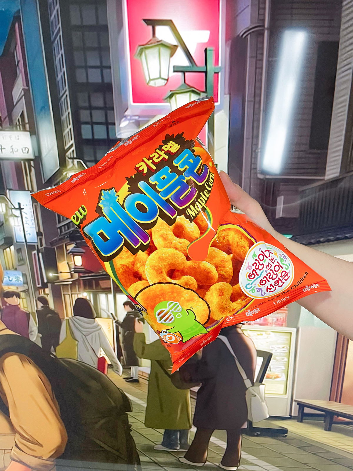 CROWN Jarabe de maple es un snack coreano de galleta inflada y liviana, con una textura crujiente que se desarma rápido al morder. El perfil de sabor está marcado por un dulzor suave con notas de jarabe de maple, que aporta un aroma cálido y ligeramente acaramelado. Las piezas suelen ser pequeñas y aireadas, pensadas para picar sin resultar pesadas. La combinación del tostado leve de la galleta con el toque dulce del maple crea un sabor simple pero agradable, ideal para quienes buscan algo dulce sin demasiada intensidad.